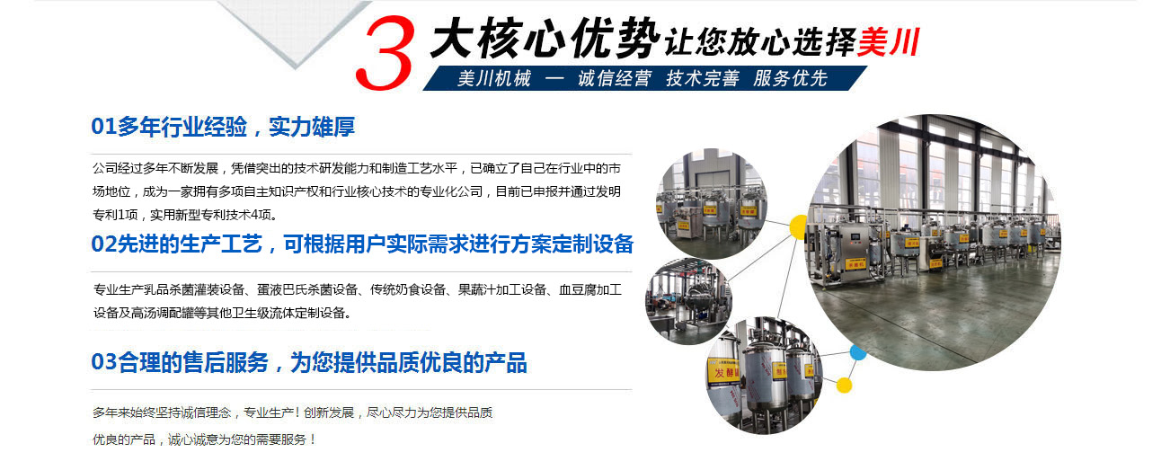 諸城市美川機(jī)械有限公司坐落在美麗的恐龍之鄉(xiāng)——山東省諸城市東部,始建于2009年,是一家集乳品殺菌灌裝、蛋液殺菌、傳統(tǒng)奶食、果蔬汁加工、血豆腐加工、高湯調(diào)配等設(shè)備研發(fā)、工藝設(shè)計、生產(chǎn)制造、安裝調(diào)試,生產(chǎn)技術(shù)專業(yè)培訓(xùn),整線規(guī)劃為一體的智能化衛(wèi)生級流體生產(chǎn)線一站式供應(yīng)商,目前擁有4個系列20多種產(chǎn)品,產(chǎn)品遠(yuǎn)銷30多個國家和地區(qū)。